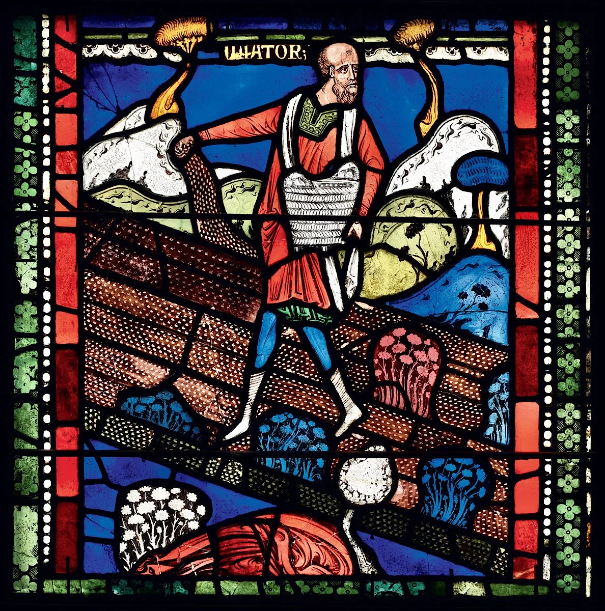 Sower among Thorns on Good Ground, from the second Bible Window, c. 1180. Canterbury Cathedral.
